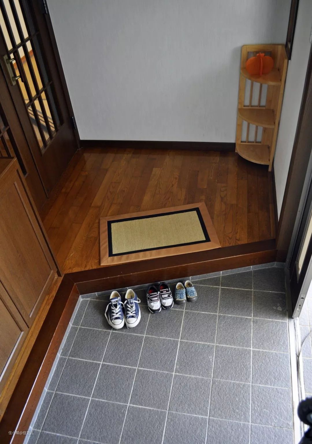 日本家庭这种下沉式玄关,一般比室内地面低10cm左右,地板高差形成一个台阶,正好坐在上面换鞋,不用另外的换鞋凳。