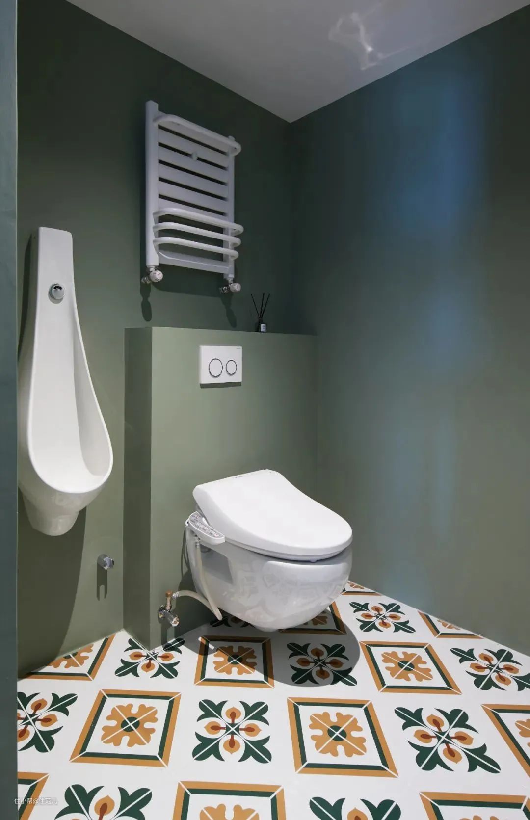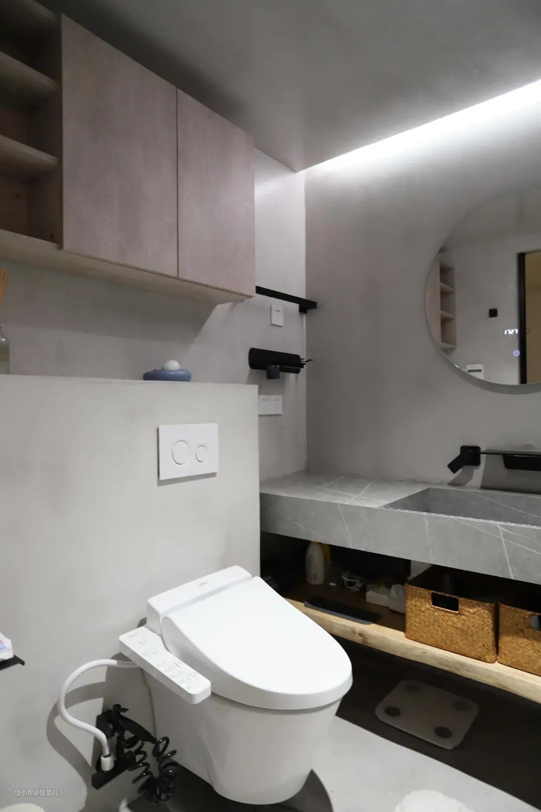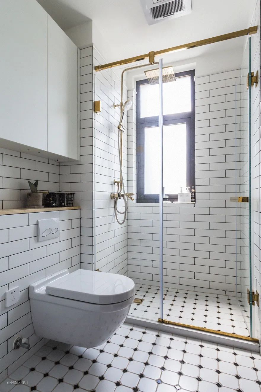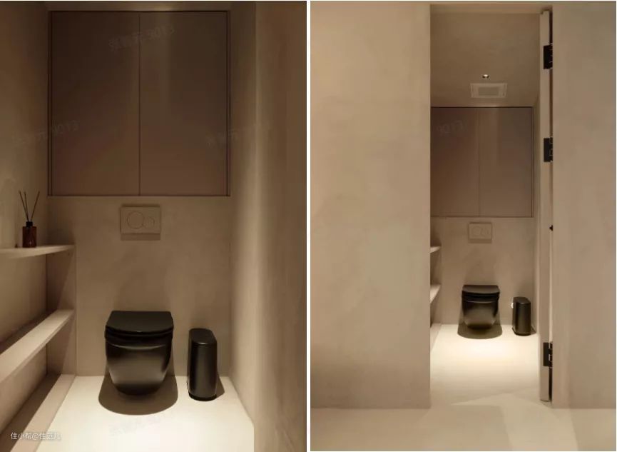 选择壁挂马桶,有两个原因:家里不是同层排水,马桶移位很麻烦,不如直接一步到位用壁挂马桶;其次是颜值高好打扫,放在暗卫很加分。
