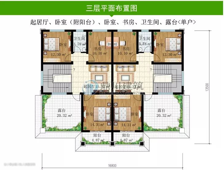 三 层:起居厅、卧室(附阳台)、卧室、书房、卫生间、露台