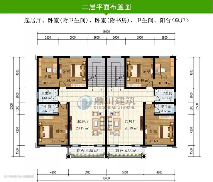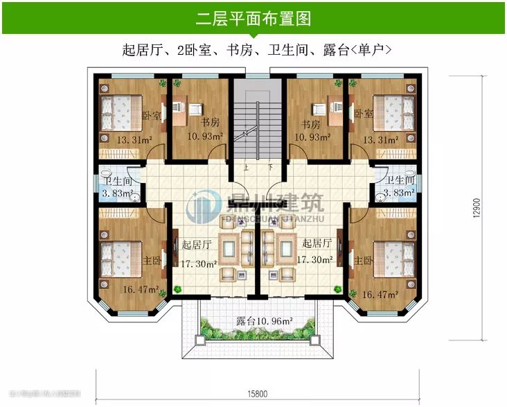 二 层:起居厅、卧室(附卫生间)、卧室(附书房)、卫生间、阳台