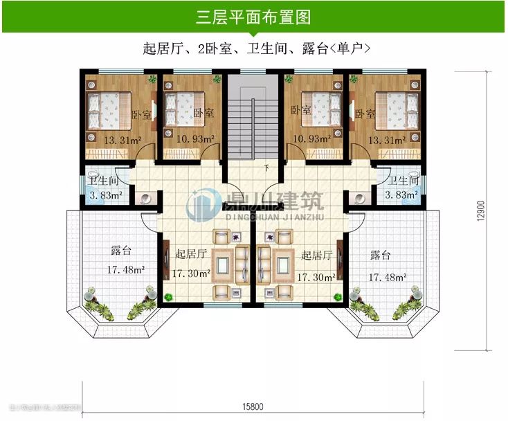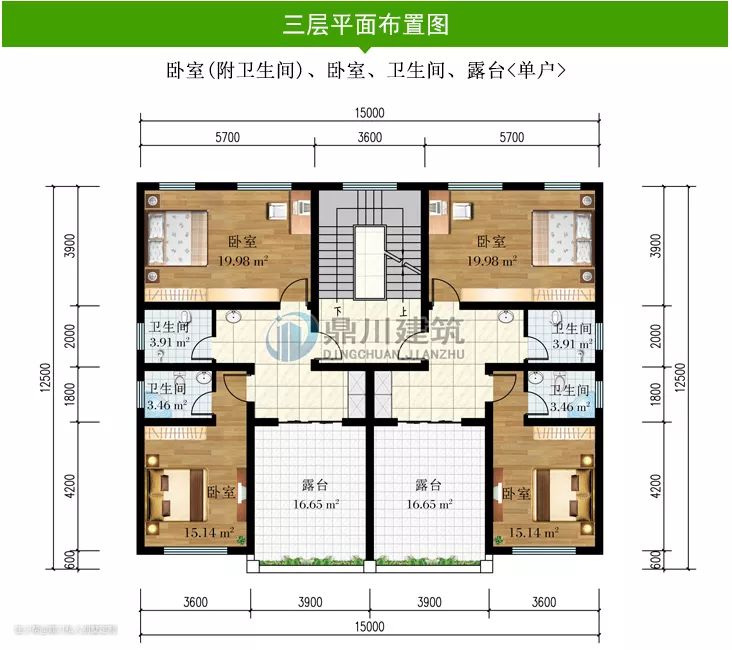 三 层:卧室(附卫生间)、卧室、卫生间、露台