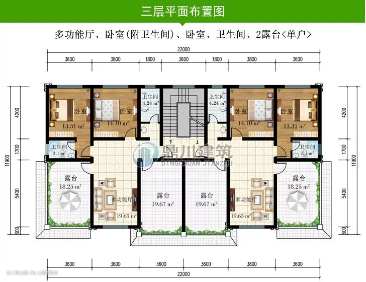 三 层:多功能厅、卧室(附卫生间)、卧室、卫生间、2露台