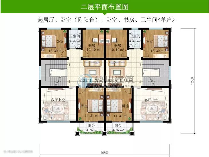 二 层:起居厅、卧室(附阳台)、卧室、书房、卫生间