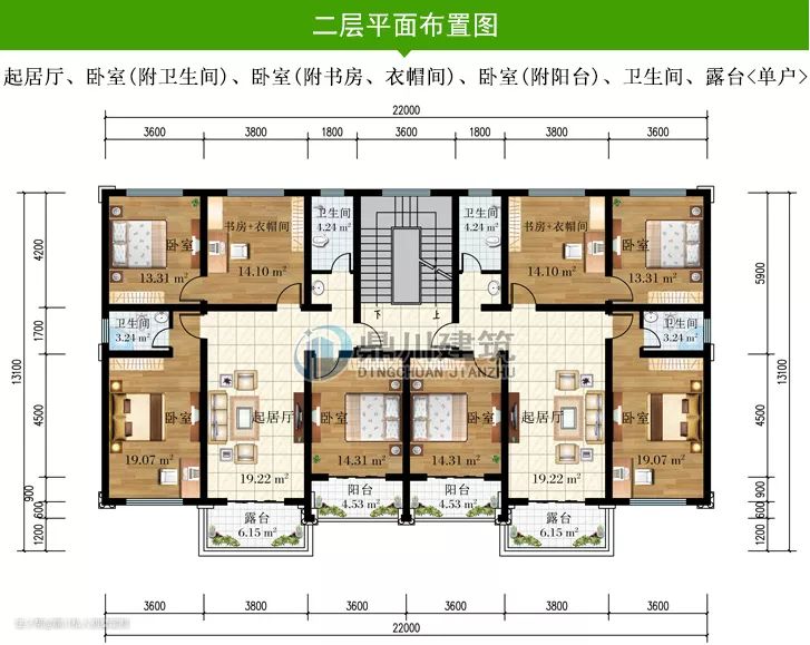 二 层:起居厅、卧室(附卫生间)、卧室(附书房、衣帽间)、卧室(附阳台)、卫生间、露台