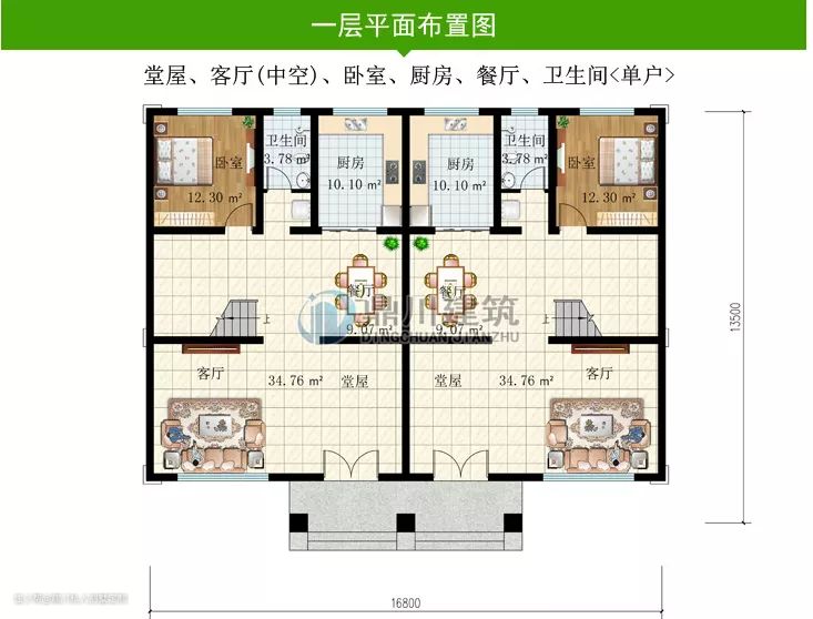 一 层:堂屋、客厅(中空)、卧室、厨房、餐厅、卫生间