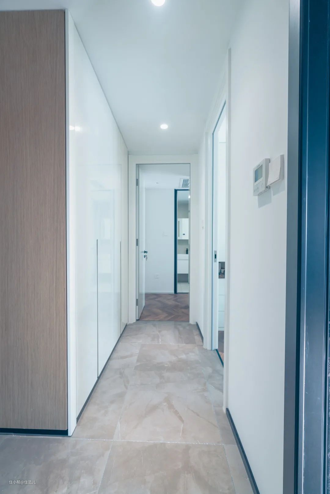 走廊的侧面,也做了白色的通顶定制柜,卫生间打扫的基本上会藏在这里了!