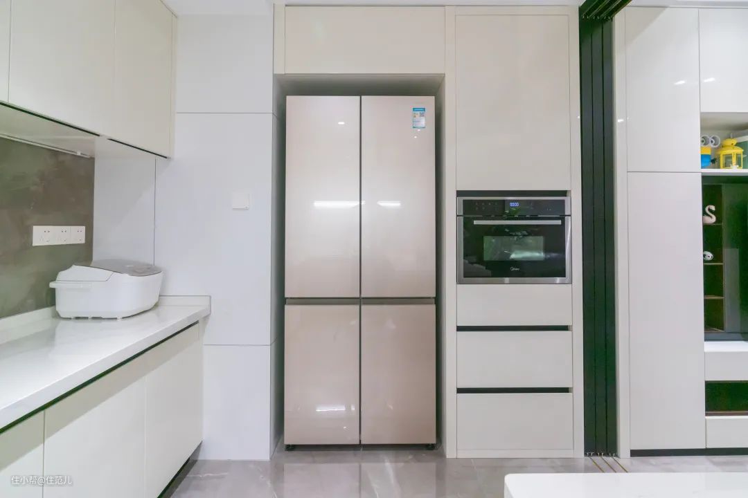 厨房做了嵌入式的松下十字双开门冰箱和烧烤箱。