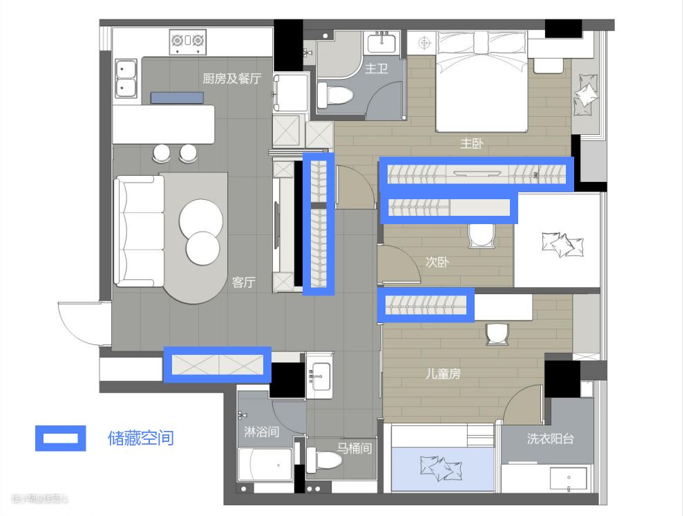 3. 在玄关、走廊处增加定制柜,综合有36㎡的超大收纳间;