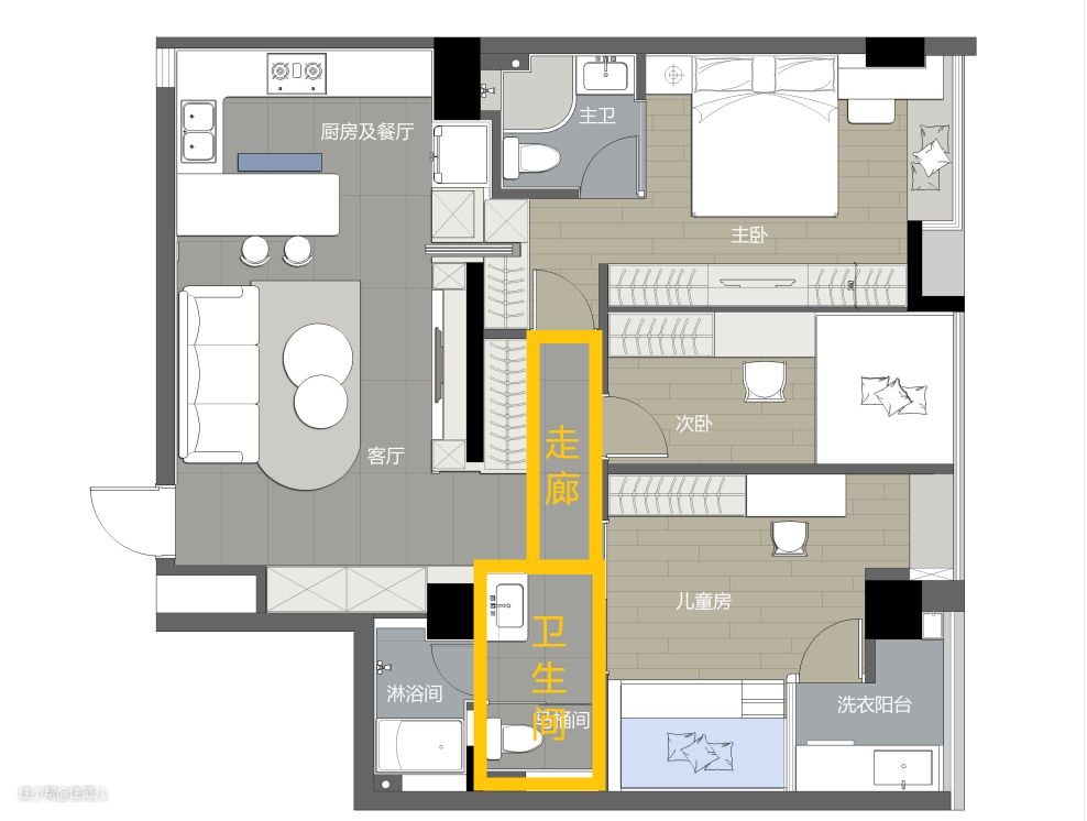 公共卫生间是结合走廊共同完成的空间布局,这也是本案的设计亮点之一。