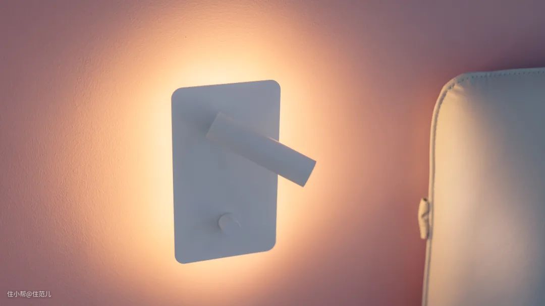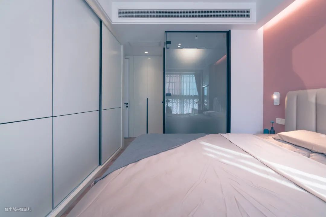 主卧并没有过多的设计,一面莫兰迪粉的床头墙柔和而温暖,还有点少女感。