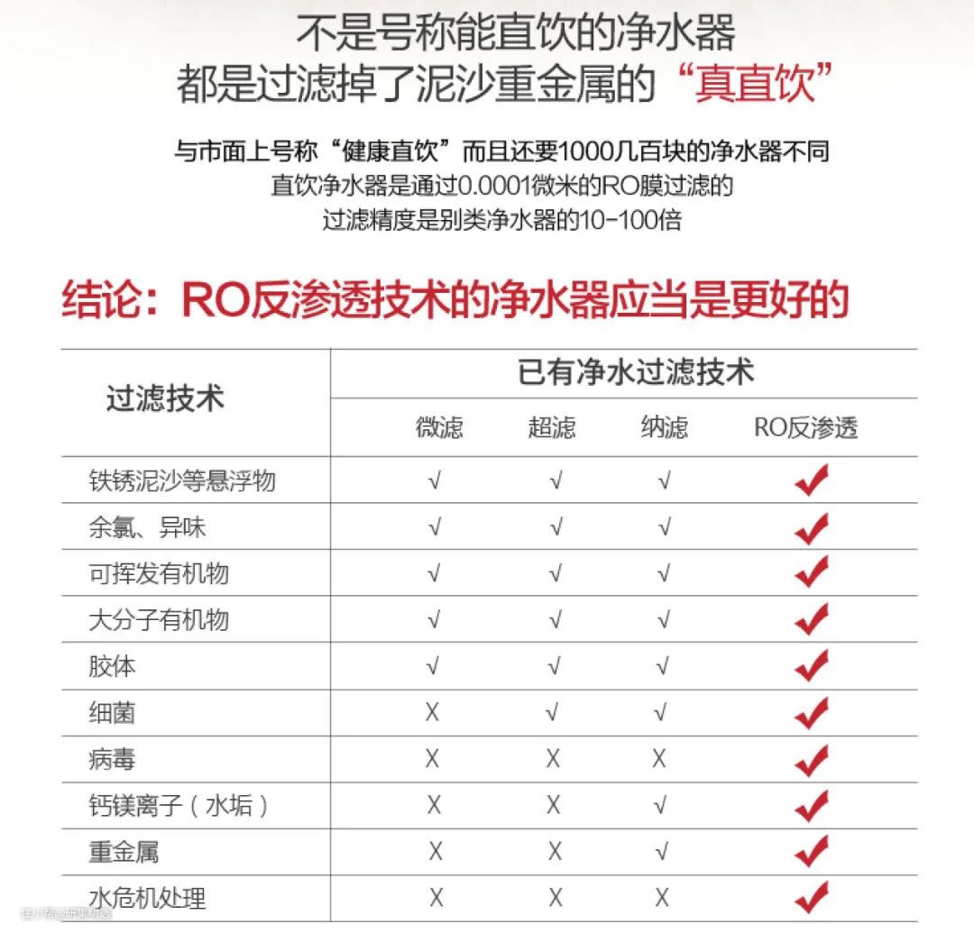 前二种是相对简单一些,不用电,不排废水,对安装条件要求不高,末端想要便宜,不插电超滤是个选择,但是过滤精度差那么点儿意思。而RO反渗透则是目前家用的终极净水方案,用这种技术得到的水是能够保证足够干净和安全的,而且能解决烦人的水垢问题。更何况自己住的房子,还有小朋友和老人,总得用好点吧。所以怡口、康丽根这些看着不错,但动辄四五千块。