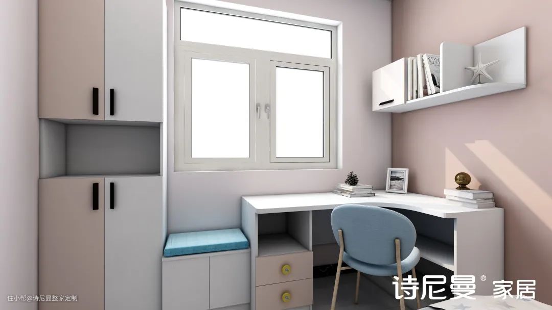 对于一些小儿童房,可能同时摆下床、书桌、衣柜会比较拥挤,那么可以顺势将飘窗改造成读书写字区,节省空间。