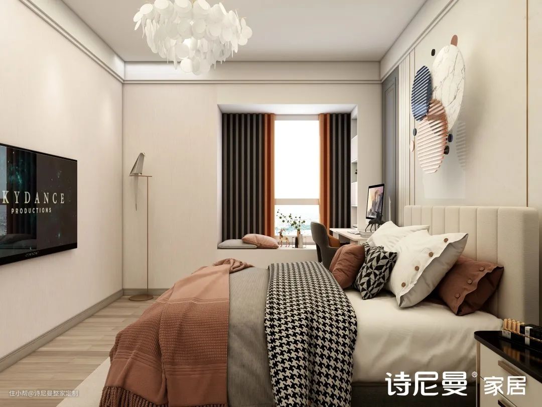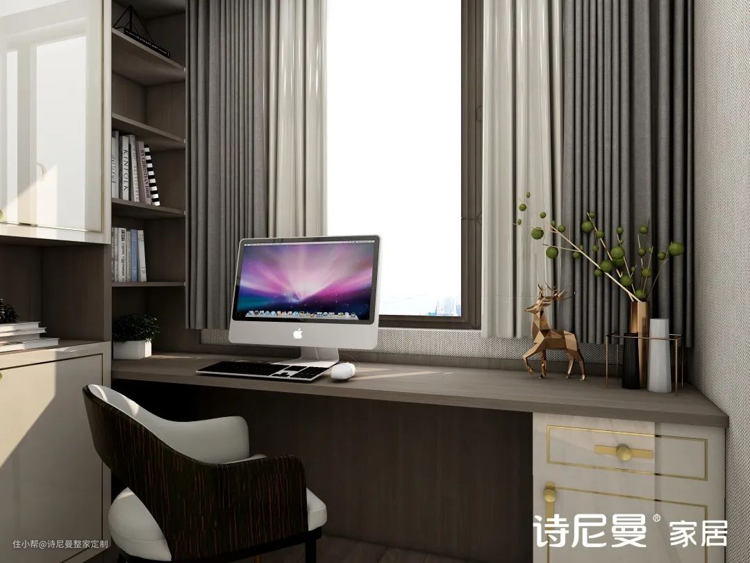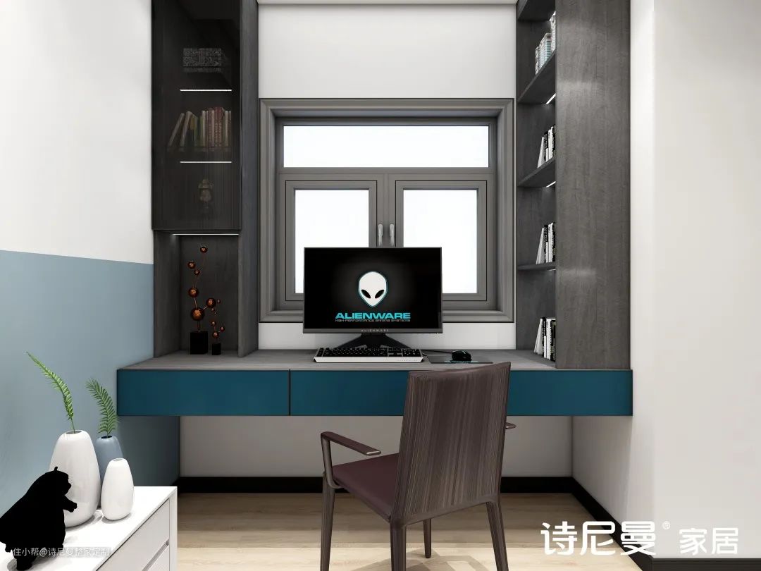 两侧放书柜,中间做成落地柜,抽屉设计存放物品拿取超方便,顶部还能坐上休息。闲时临窗而坐,阳光与书籍,无比惬意。
