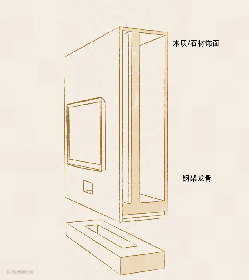 在有承重需求,后方无墙体支撑时,可以使用钢架龙骨的方式来打造柜体,一般可以将钢架龙骨就近固定在墙面、地面、顶面上,营造出的悬浮感效果更佳。