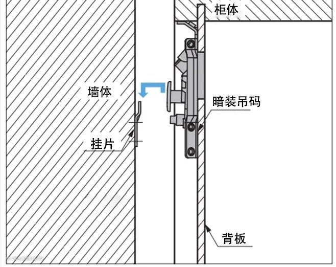 暗装吊码的主体安装在柜体外部后方,挂片安装在承重墙壁上,现将柜体与吊码主体固定,再将吊码与挂片固定,即可安装完成。额定承重可达150~200kg。