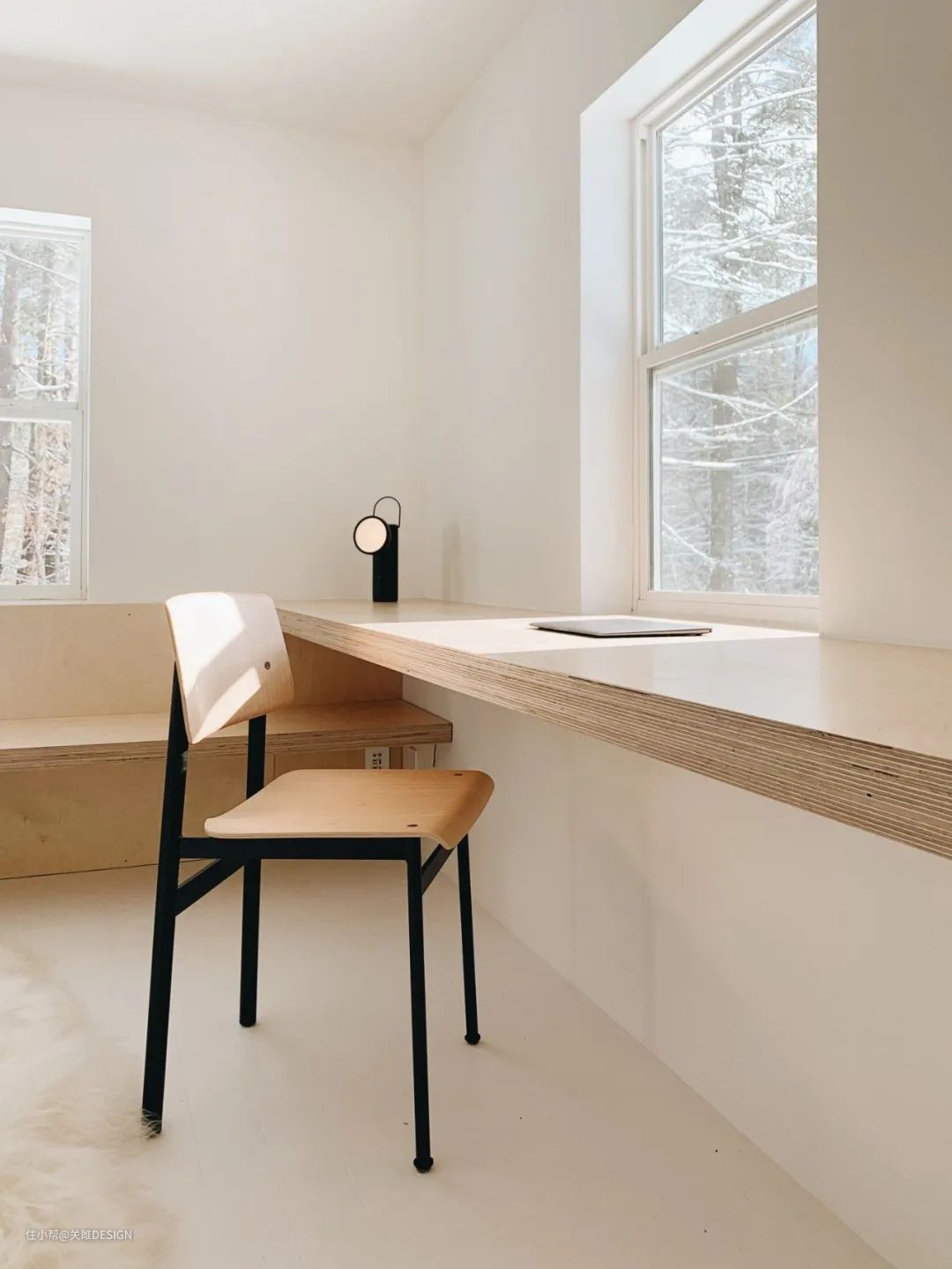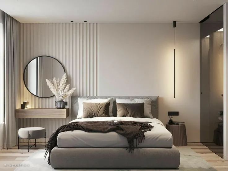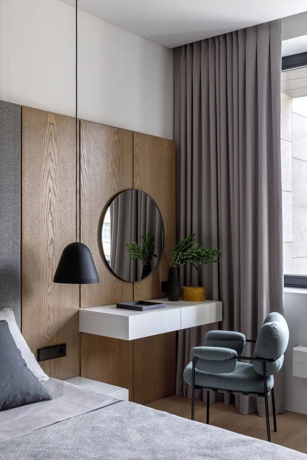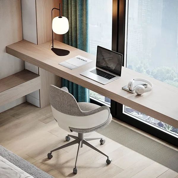 悬空的桌板或者薄柜可以当做书桌或梳妆台使用,没有桌腿的设计减轻了对地面的压迫,视觉上更加轻盈灵活,也更具高级感。
