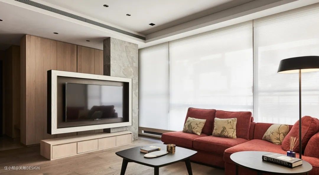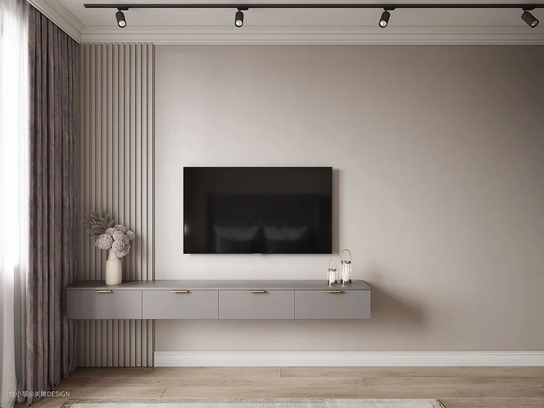 相较于落地的电视柜,悬浮式电视柜下方悬空,与地面留有一定距离,视觉上更加轻盈,空间层次也更加丰富。