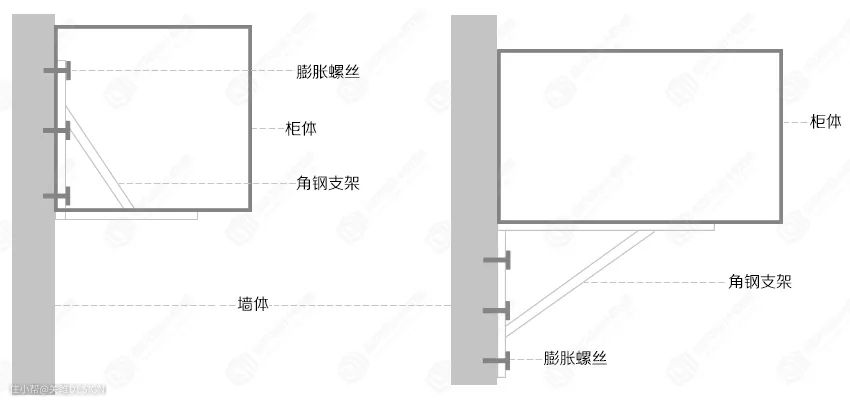对于有承重需求的柜体可以使用角钢支架固定,这种三角结构的支撑可以大幅提升柜子的承重能力。以下两种安装方式都可以使用,相对比较第一种的安装方式更美观些,根据角钢厚度和尺寸不同,它的额定承重也不同,最高可达100kg左右。