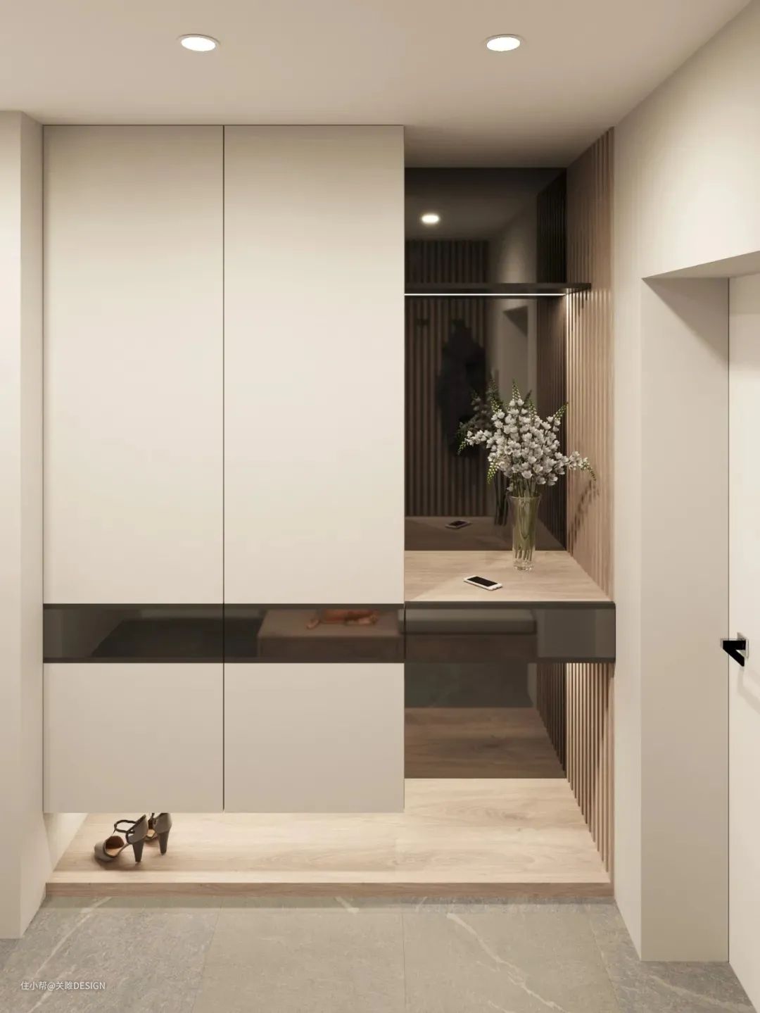 下方镂空的玄关柜可以让玄关区域的使用变得更加方便,下方镂空的位置可以放置常穿的鞋子,安装感应式灯带还可以让回家更有仪式感,换鞋的动作变得更加顺畅。