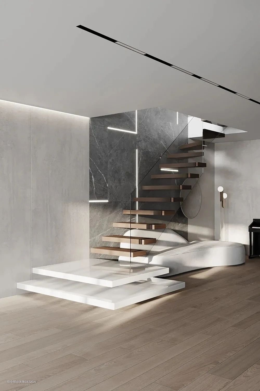 悬浮设计常常会与灯光设计相结合,共同营造更具现代感的氛围。