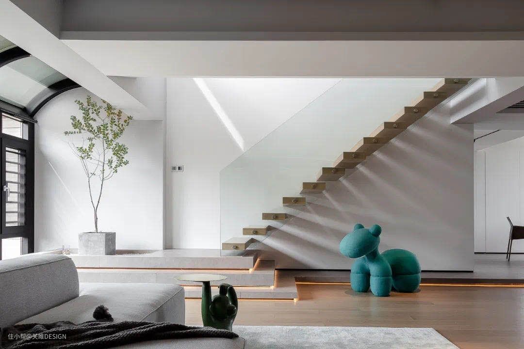 悬浮式楼梯也就是我们常说的挑空式踏步楼梯,凭借高颜值和通透感受到大家的喜爱,这类型的楼梯的装饰感很强,轻盈优雅的悬浮式设计,没有多余的线条,楼梯踏步直接从墙面延伸出来,除了自身的功能性之外更像是一个艺术装饰品。