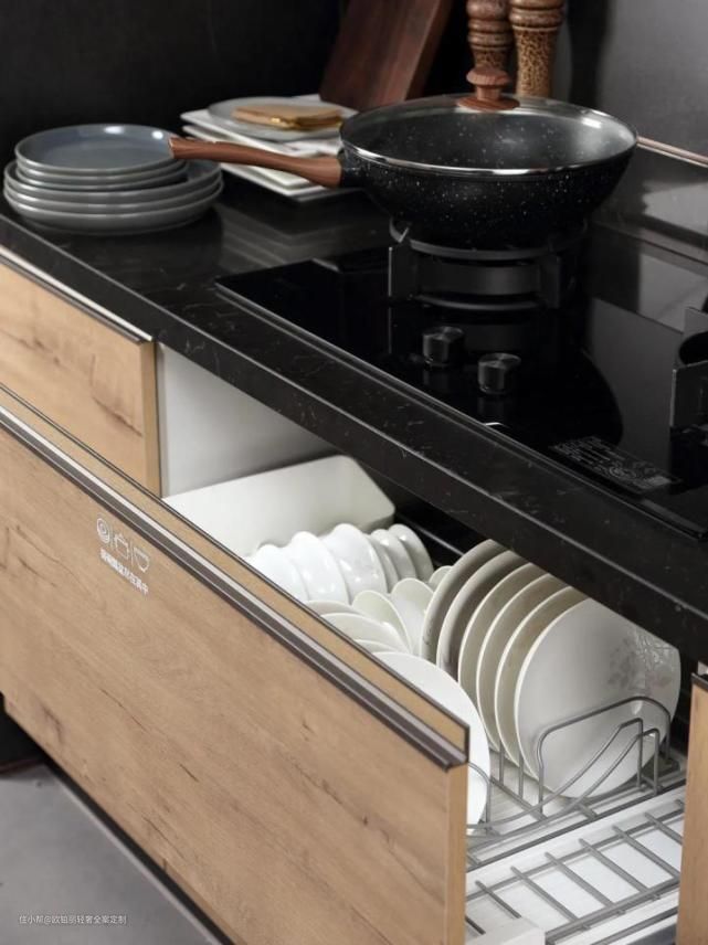 地柜也不能浪费,加装碗碟拉篮,成为锅碗瓢盆的欢乐聚集地。