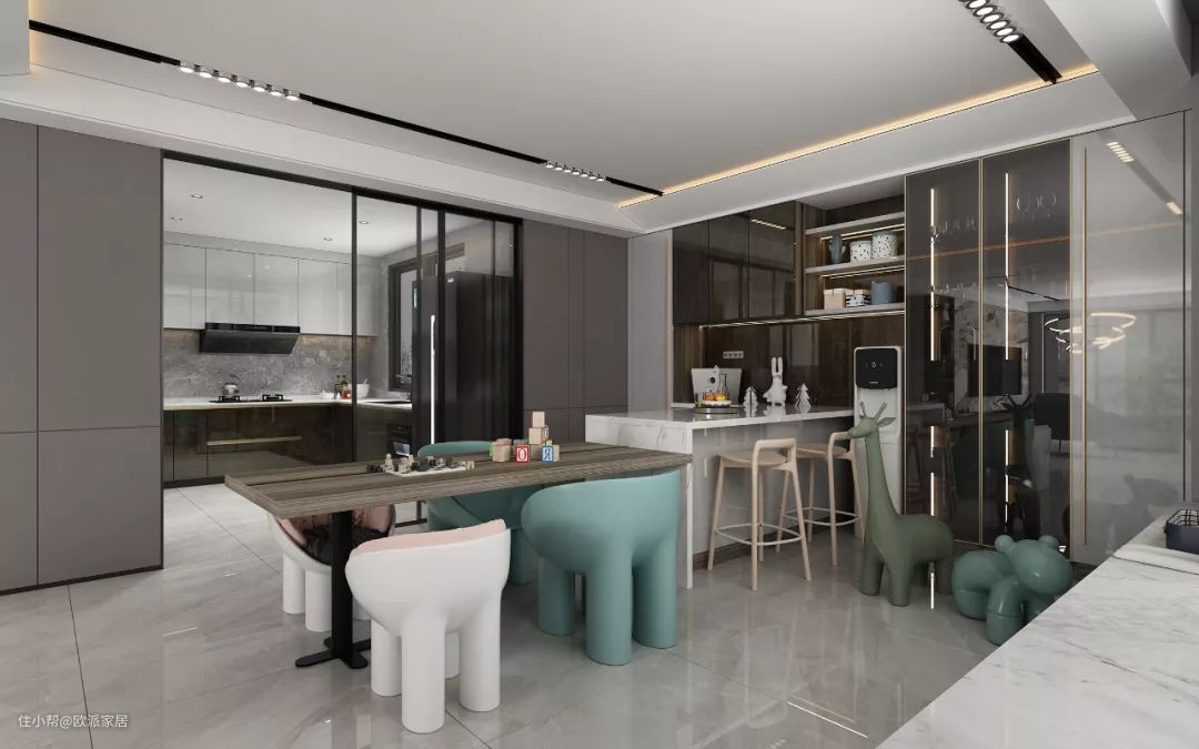 慕晓采用石纹超晶门板搭配铝框玻璃元素,通过门板的镜面效果与玻璃门实现光影互动,而亮色餐椅的加入,摩登中又充满童趣性。