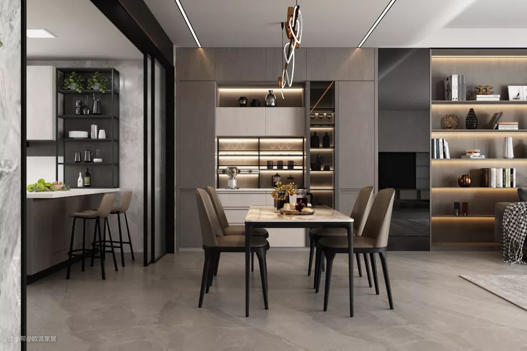 餐厅内的高级定制酒柜搭载酒格挂件的壁挂系统,不仅外观颜值高,还能丰富完善厨房功能,满足餐饮多样化需求。