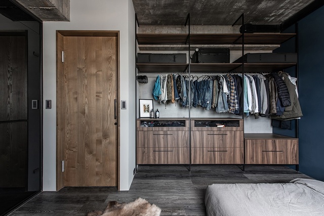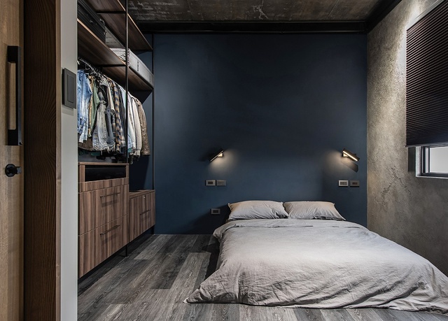 灰白相色,粗糙相对,立面色调,两两匀和。背景墙面蓝如深海,再添壁灯两盏,自有鱼翔浅底,竟自由。一片孤白的榻榻米,如扁舟一叶,驶唯其上。趁长夜,水波不兴,自好安歇罢。虽目见粗鄙,是原始加之野蛮的黑铁框架与老木肌理,然衣橱的开放与随意,更尚生活之风度。