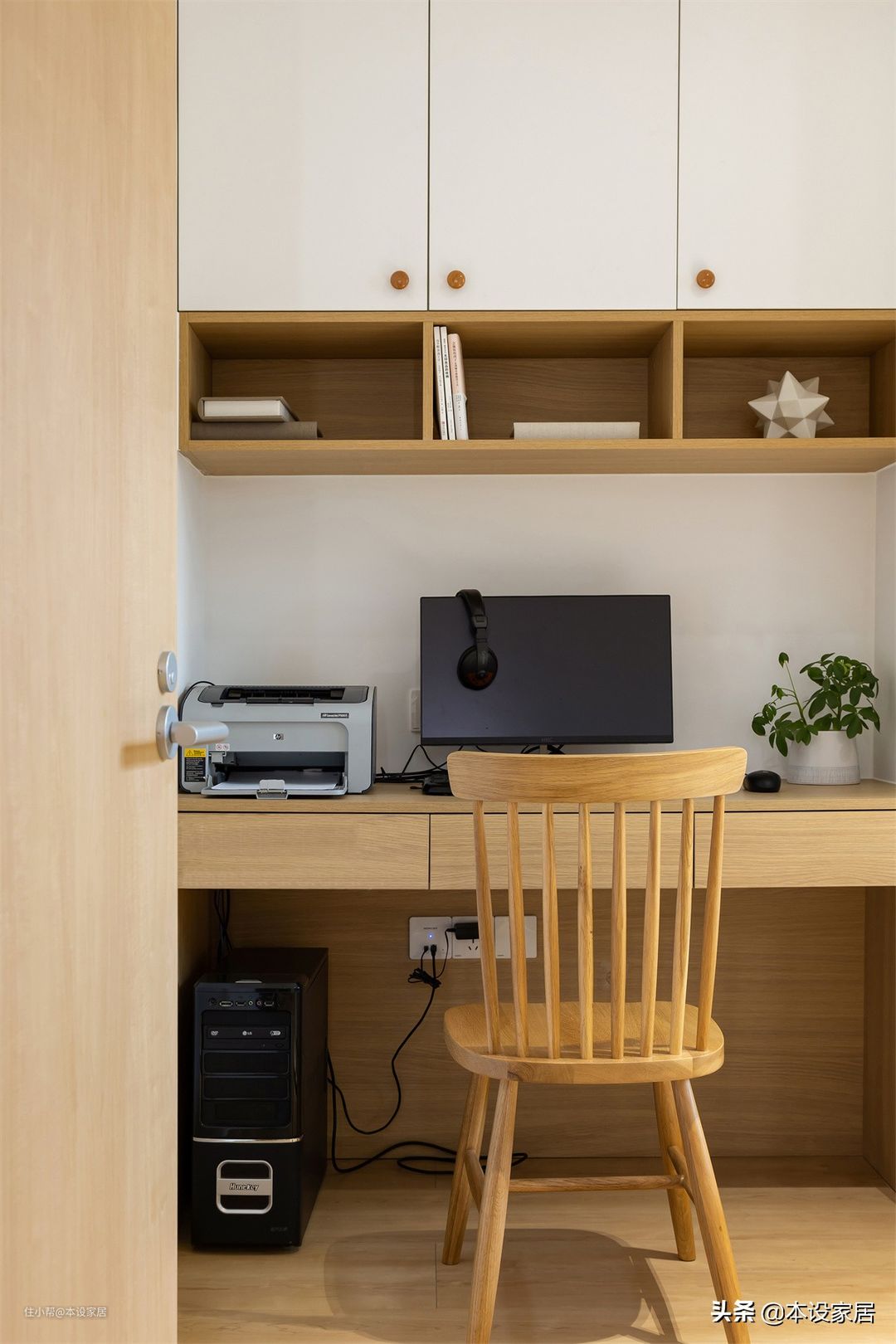 男主人有在家办公的需求,定制原木色家具简单实用,在这小小的空间里,看到了爱的温度。
