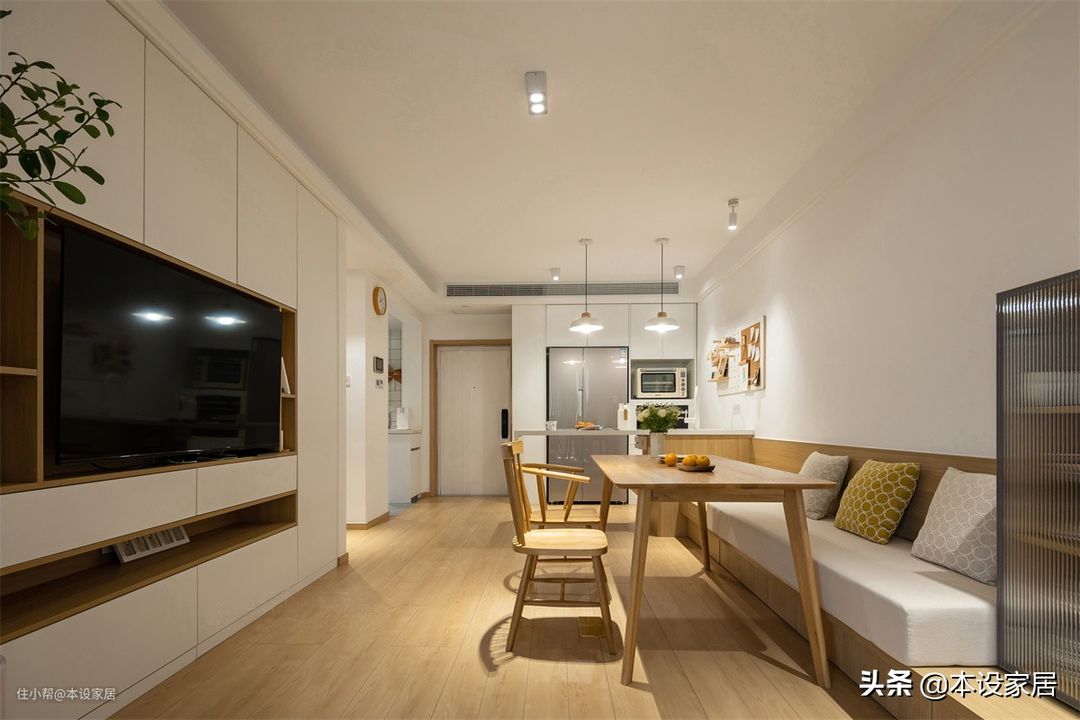 客餐厅地面选用满铺木地板,从入户门一直延伸到卧室,无主灯设计让空间显得高,不压抑。有藏有露的白色电视柜设计很值得借鉴,把生活物品有序收到储物柜内,保持环境的整洁。