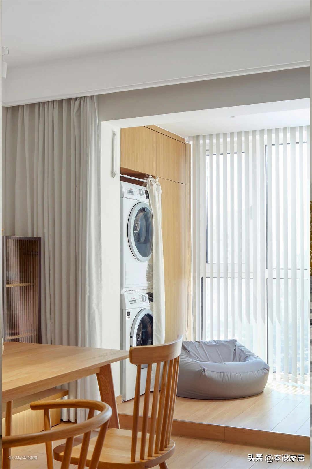 阳台拥有宽大的落地玻璃窗,采光极好,木制地台抬高150mm,打造一个休闲场所,选用的白色竖百叶窗帘,能营造出唯美光影,拉开窗帘,四季颜色尽在眼底,在此看书或欣赏窗外景色,非常解压。两边定制原木色高柜,放置洗衣机和烘干机,以及吸尘器等杂物,关上柜门,还你一个干净的环境。