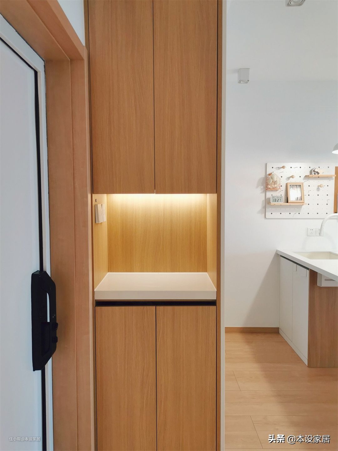 为了让入户门与整体色调统一,门套换成原木色,原有猪肝色的门改成白色,看起来干净整洁。由于没有独立玄关,把宽度为600mm玄关柜与西厨结合起来,上部放置配电箱,中间镂空放置钥匙等小件物品,下部放置当季鞋,加上右边的白色矮柜,满足日常收纳需求。橡木色高柜在LED灯带渲染下,回家的那一刻,便能感受到家的温暖。