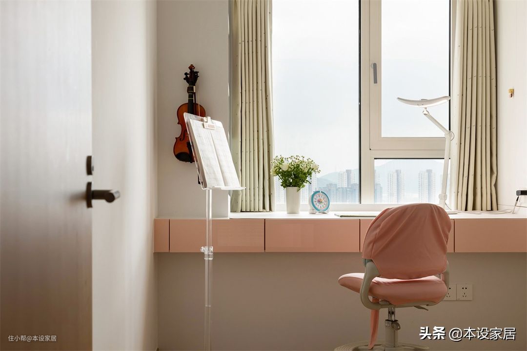 女儿房融入淡淡的粉色,满足女孩公主梦,结合窗户制作一个学习桌,光线充足。