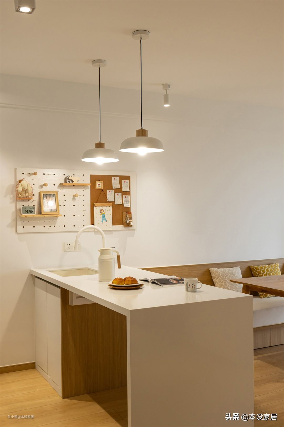 岛台受到越来越多家庭的欢迎,平时制作甜点,备餐,吃个早餐都很方便,搭配一个水槽,回家便能洗手,洗水果也不用跑厨房。岛台高度为900mm,白色石英石台面和水龙头自带颜值,再加上墙面的洞洞板和天花的吊灯,营造出一个简约自然,温暖又舒适的氛围。对于小户型来说,通过合理的设计,也能实现岛台自由。
