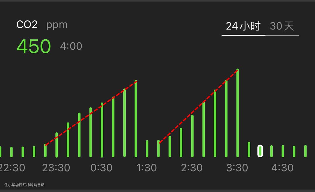 对比开篇楼主贴出的曲线,可以明显看到在开启新风模式后,卧室内的二氧化碳含量始终平稳,且保持在极低的水平。无论是学习还是工作,这一点都是非常有用的。