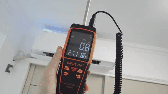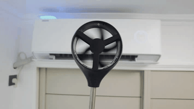 首先在空调开机模式下,将风速仪放到位于空调正下方位置。可以看到风速仪的风扇缓慢转动 ▲