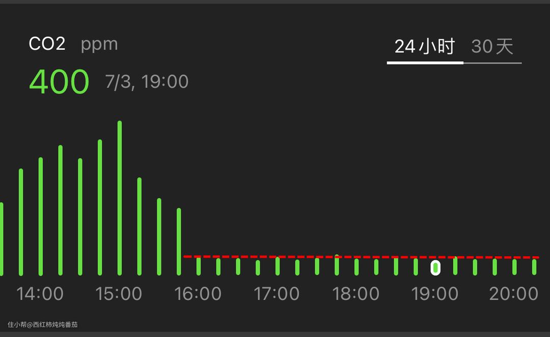 因为夏天开空调的关系,楼主一个人窝在书房的时候,一般都是关着门的。书房面积本来就不大,楼主把自己们在里面埋头加班加点,不知不觉二氧化碳含量就慢慢上去了。这时候,楼主只能将书房门打开,通风约 30min,使二氧化碳含量回落至正常水平,如此循环往复,使自己在夜间仍能保持头脑清醒 ▲
