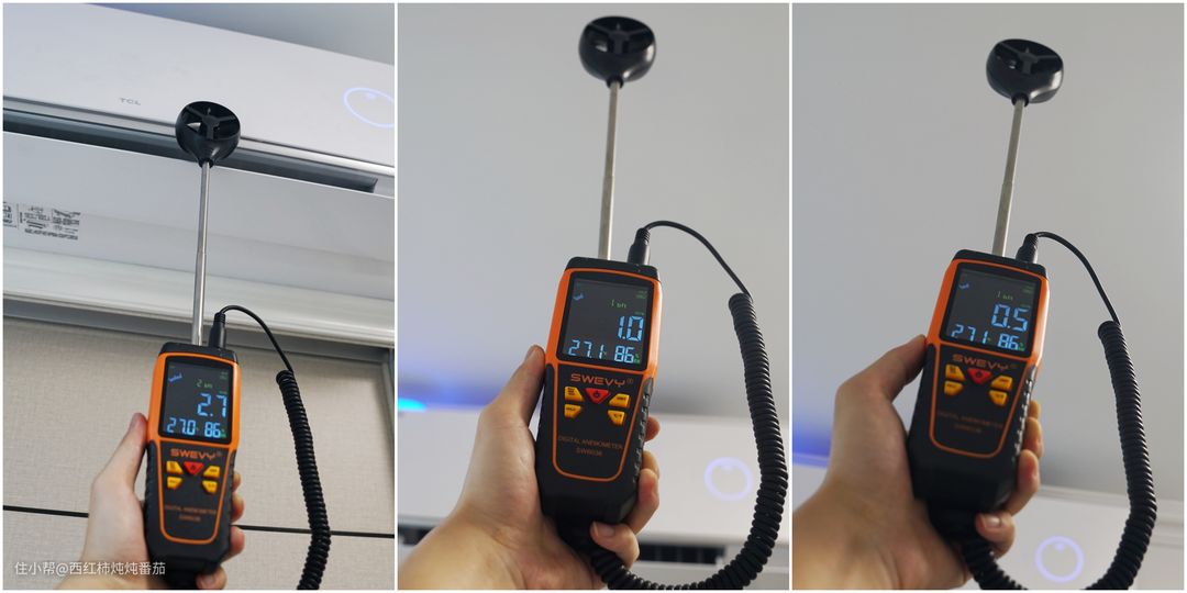 这个过程中,楼主分别在距离空调水平方向约 1米、2米以及 2.5米位置测试了风速,得到数据如上 ▲