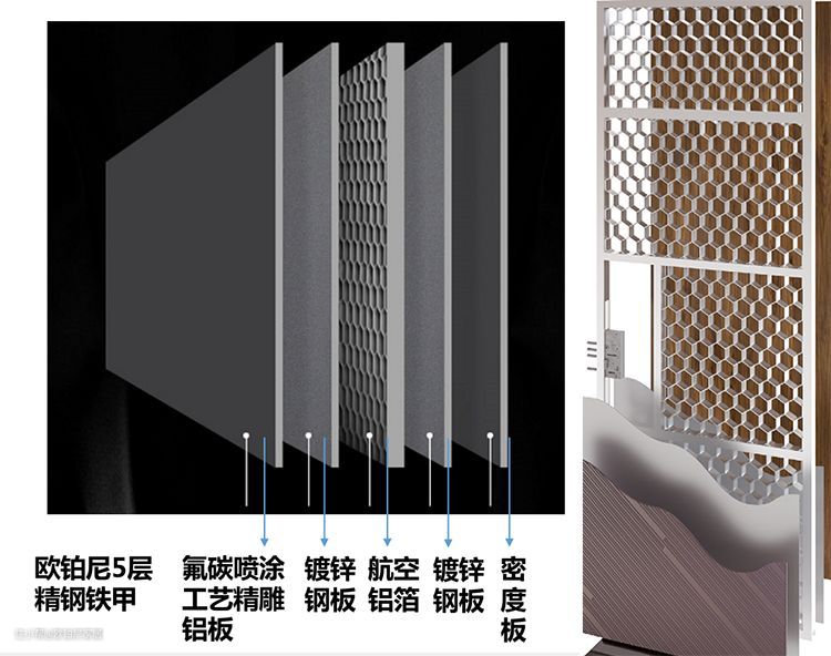 一些优质的入户门甚至会采用行业最高航空级铝箔蜂窝全金属铝制材质作为门扇填充,与航天航空、大飞机机翼同级别铝箔材料,耐高温达1328度,防火耐高温,支撑性强,门扇强度高,搭配钢制装甲龙骨,门扇整体性能更加安全稳固。