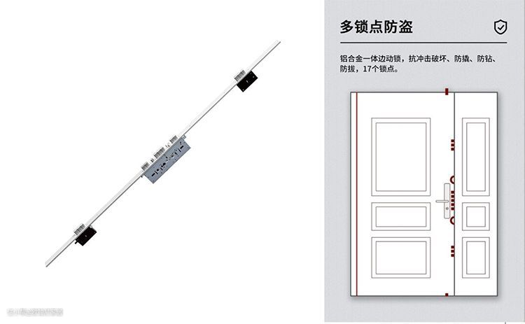 对安全性能要求更高的业主,则可以考虑选择增加“多锁点防盗”系统:采用实心合金钢锻造,斜舌伸缩补偿技术,防暴力开启性能提升60% ,超 C 级铜加钢 13 叶片锁芯,超国家 A 级锁芯 270 倍,密匙量高达 1600 万,互开率低,互开率百万分之一,技术性开启时间达到 270 分钟以上。有这样的安全保障,就算自己外出旅游或出差,也完全不用担心家里财物安全问题。