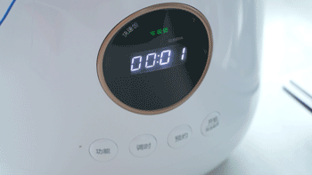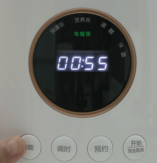 拨动按键的同时,显示面板也会有相应的变化,显示屏上层显示的是电饭煲的功能:精华饭、快速饭、营养蒸、蛋糕、保温。