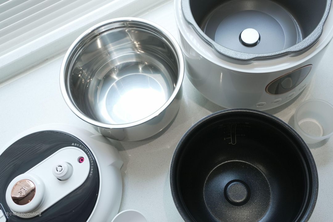 一个不粘内胆和一个食品接触级SUS304不锈钢,像平时煮饭、煮粥、做蛋糕使用铝内胆锅比较合适,而像其他煲汤、炖肉则可以选择不锈钢锅,两个锅轮番上阵在烹饪时自然更省时省事。
