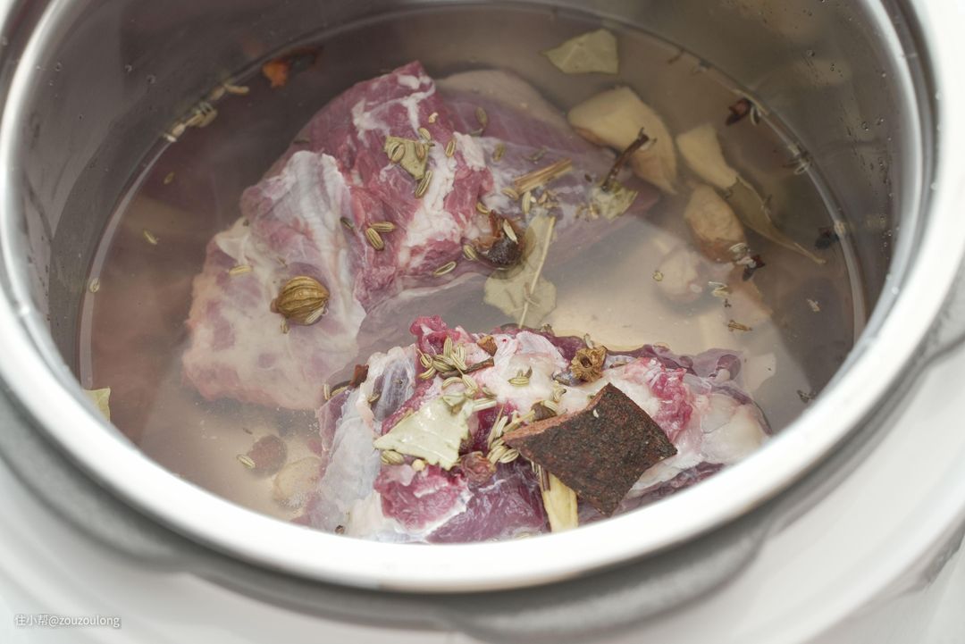我很喜欢吃牛肉,其中凉拌牛肉是我最喜欢的一道菜,首先将牛肉和沙姜八角等一起放入锅里。