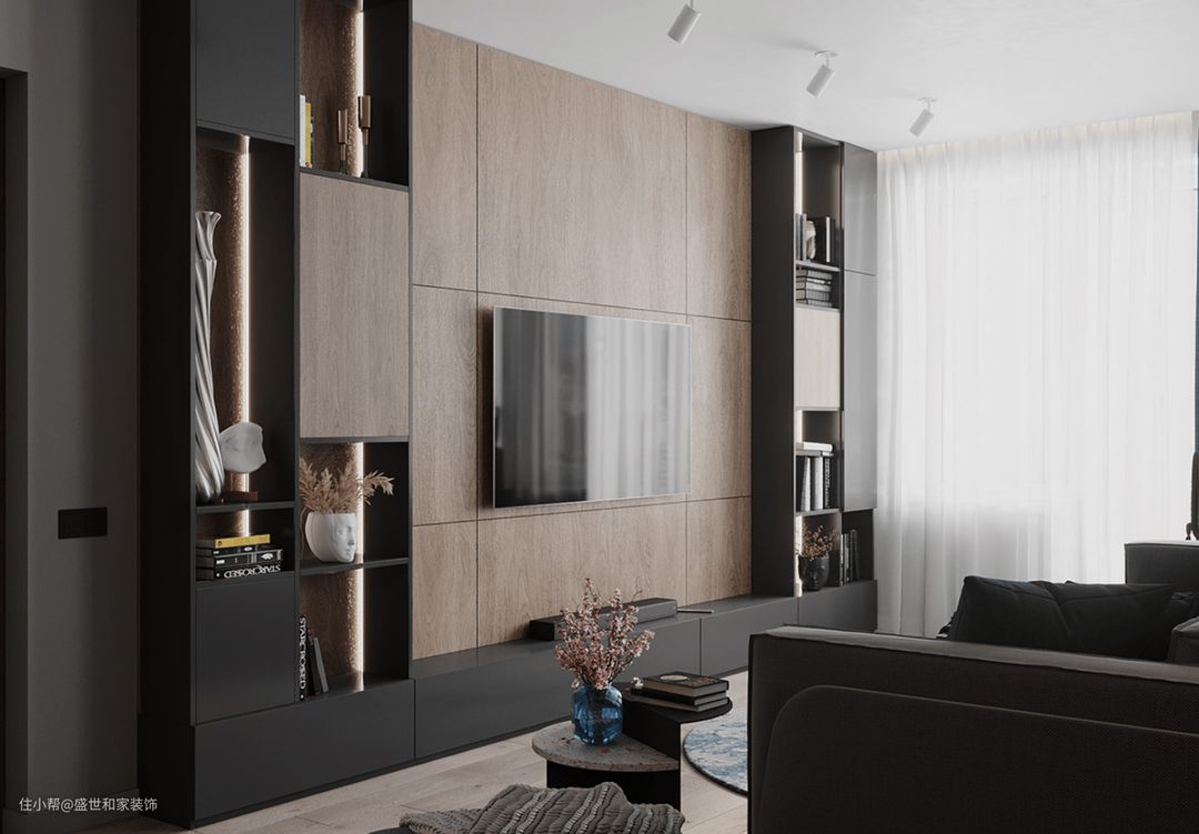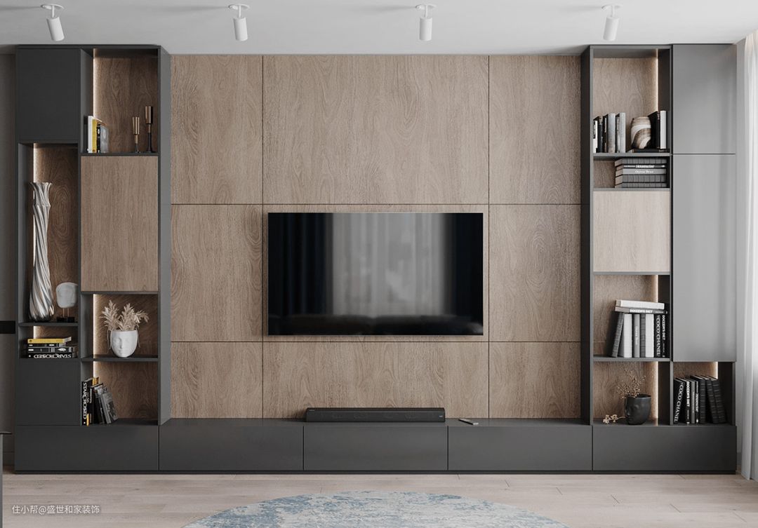 背光显示角落也安装在电视墙上感兴趣的区域,它们从光滑的胡桃木墙板中挤出。
