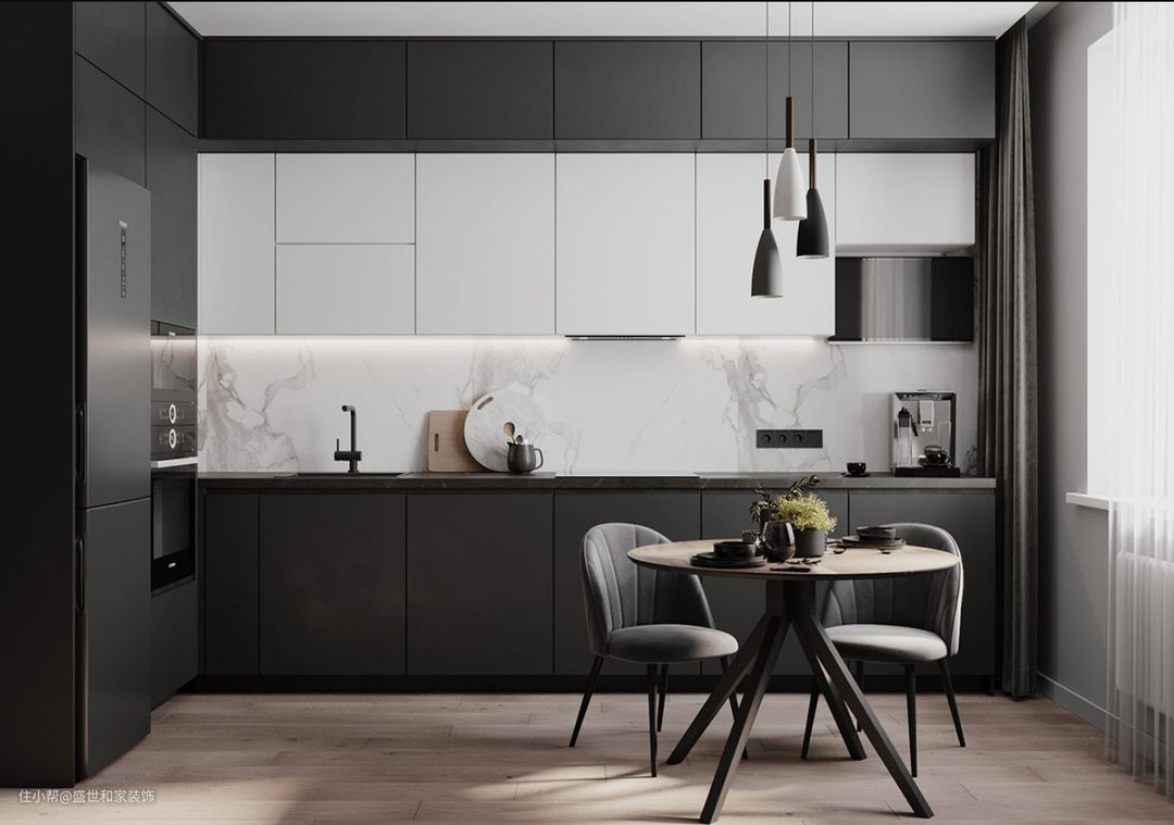 黑色、白色和灰色的厨房在小餐厅周围画成 L 形。
