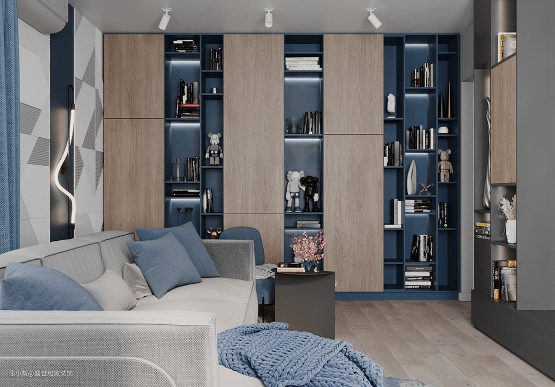 一个引人注目的蓝色书柜为这种深色调饱和的装饰方案提供了时尚的灵感。安装 LED 灯条以减轻外观,而装饰品自然地打破了广阔的空间。一系列胡桃木橱柜正面优雅地破坏了色彩的连续性,并简化了大量引人注目的物品。