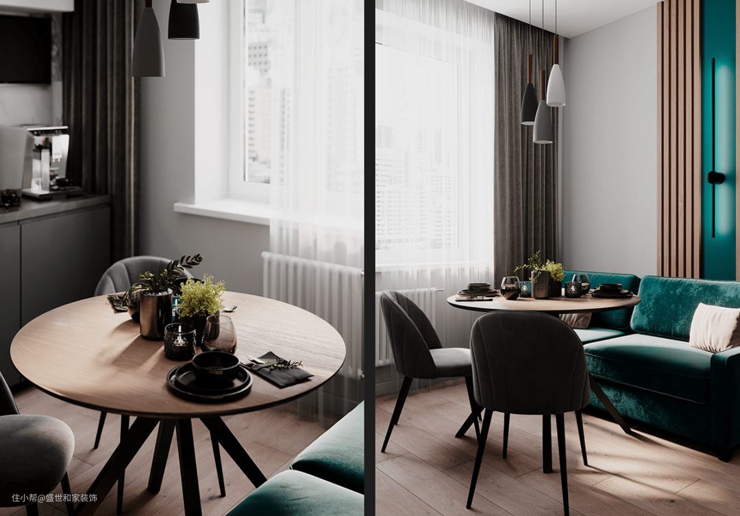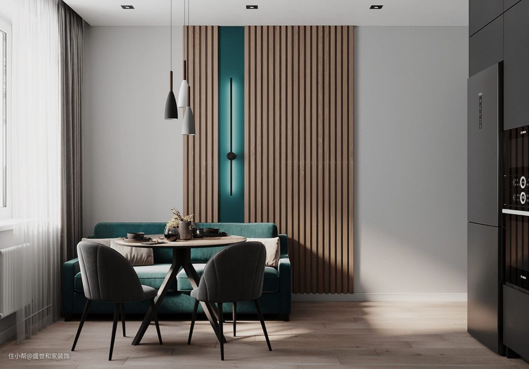 走进厨房餐厅,墨蓝色元素被换成了青色的时刻,小沙发的形状和彩绘的墙壁。