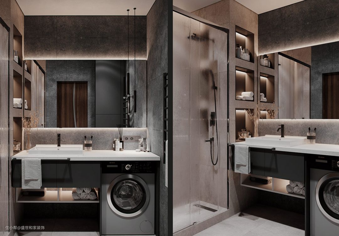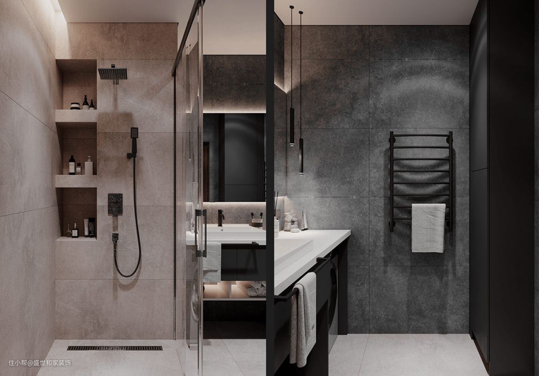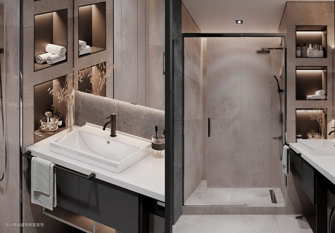 温暖的米色和凉爽的灰色瓷砖在紧凑的空间中相互平衡。