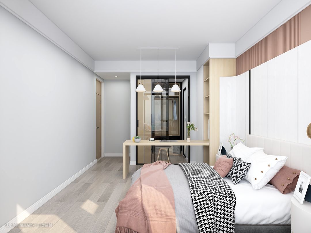 【主卧】主卧朝阳,整个卧室流动舒适。靠窗处做飘窗设计,在保证了充足的光照同时又提供了安静、舒适的休息环境,为主人提供饭后休闲对坐之地。粉色与白色相拼接的背景墙将现代感和浪漫氛围充分营造出来,层次感更为巧妙。